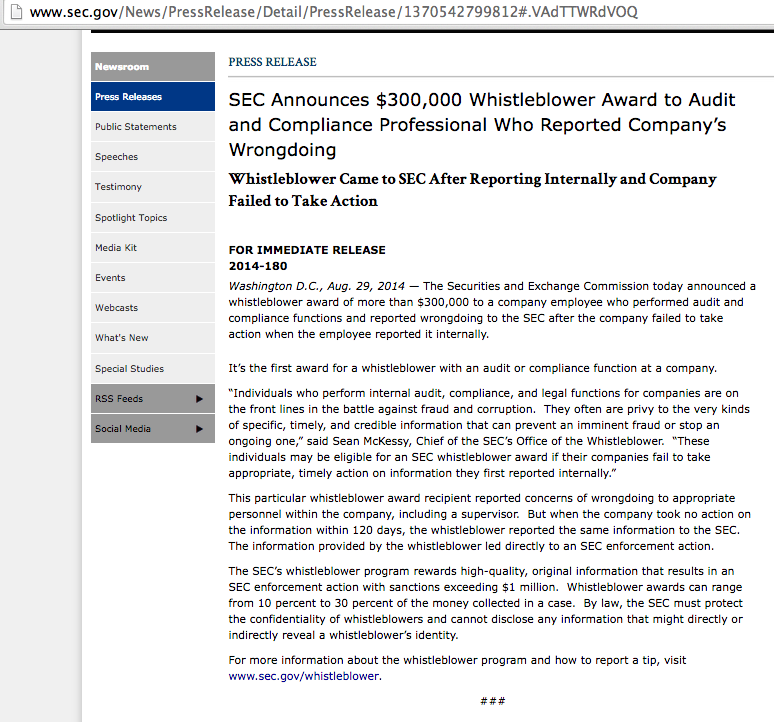 SEC Announces $300,000 Whistleblower Award to Audit and Compliance Professional